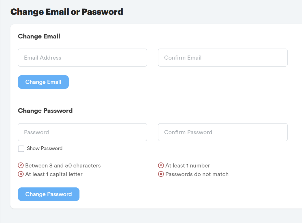 To change your email address, enter your email into both boxes and click 'change email'. To change your password, enter your new password into both boxes and click 'change password'.