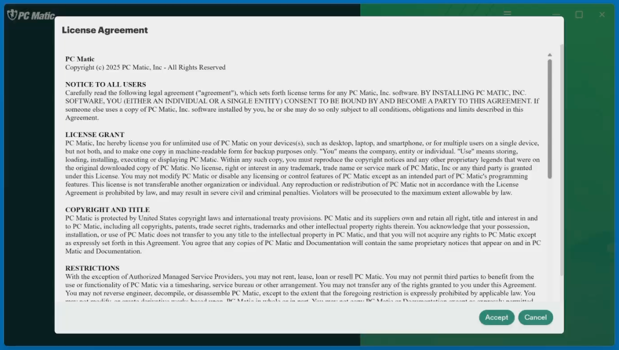 - When PC Matic launches, enter the login credentials that you created with your purchase, or you can use the phone on file for text verification.