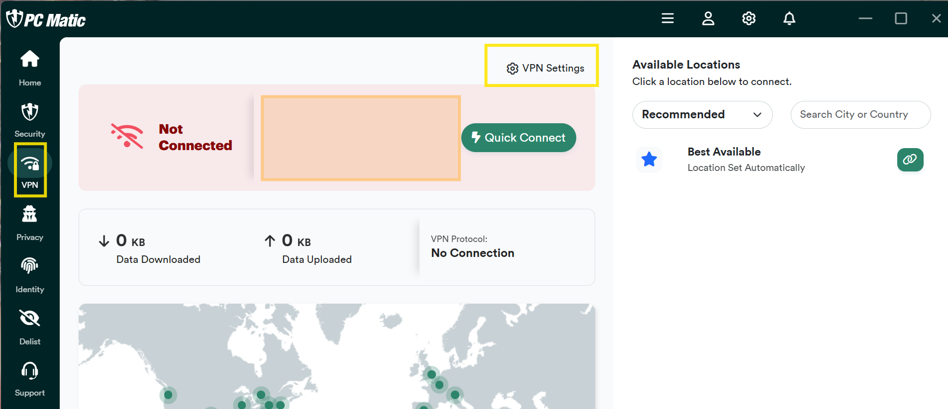 - Click the VPN Tab on the left side of the PC Matic Window, then click the Quick Connect button.