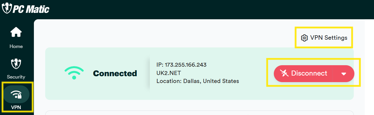 - Open PC Matic and click the VPN icon on the left menu tab. Click the Disconnect button and wait until the dashboard shows Not Connected. Then click the VPN Settings button.