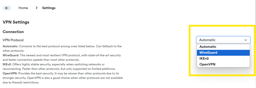 - Click the drop down box beside VPN Protocol, and choose Wireguard.