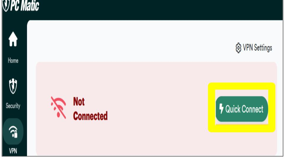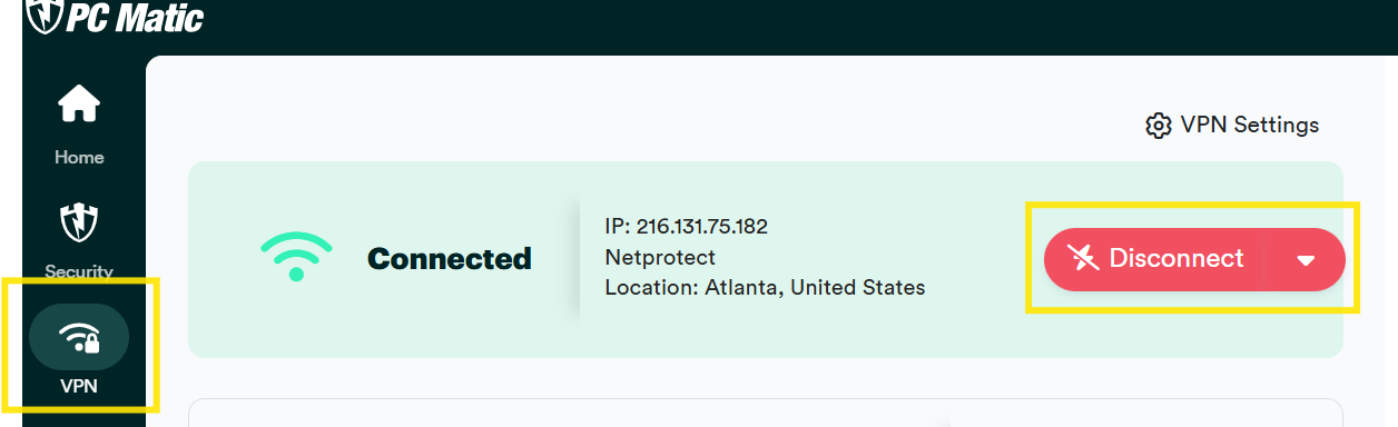 - Open PC Matic and click the VPN icon on the left menu tab. Click the Disconnect button and wait until the dashboard shows Not Connected.