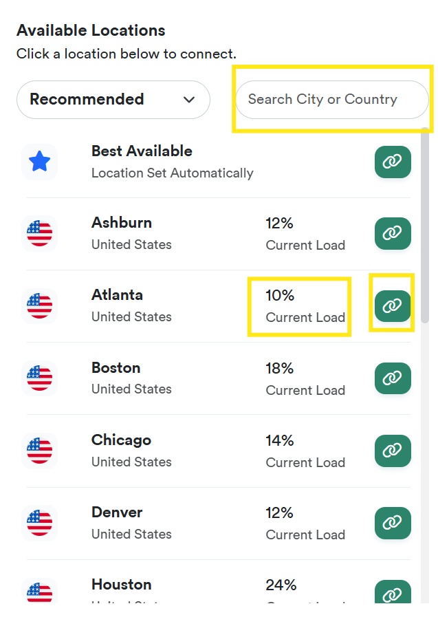 - Look at the lists of servers on the left side of the VPN Dashboard. Find the server location closest to your residence with the smallest Current Load, and press the green connect link button.